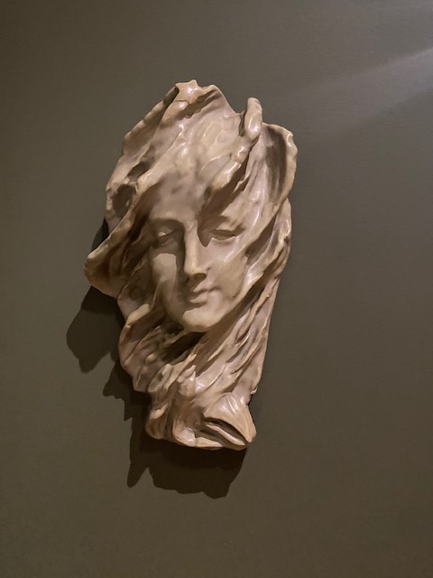 As my first visit to the museum, I kept having a sense of being home back in New York. The green awning and the heavy churchlike doors at the entrance certainly made me think of several places back home. The Stebbins Collection was on display and I found myself particularly drawn to a sketch of hands. Several others also lingered in front of this piece. I thought about what our hands mean – strength, grasp, fragility, the stories that our hands can tell without us thinking about it. Some people looked at their companion and conversed about the piece. There are few sculptures in this exhibition but the one I found myself drawn to was one of a female face hanging on a wall in their Art Nouveau exhibition room. It’s as if her face is immersed from strong winds or a storm, and yet her downcast face seems resilient.